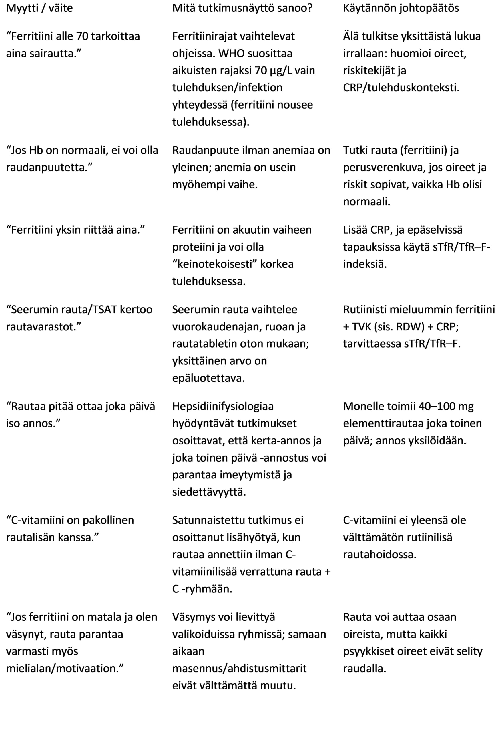 Julkisuudessa elää myytti “ferritiini alle 70 = sairautta”. Tutkimusnäyttö ei tue yhtä taikalukua kaikille. WHO käyttää aikuisten 70 µg/L -rajaa nimenomaan vain tulehduksen tai infektion yhteydessä, koska ferritiini voi silloin olla harhaanjohtavasti normaali tai korkea. Lisäksi ferritiinin kynnysarvo esimerkiksi psyykkisten oireiden osalta voi olla hyvinkin vaihteleva.